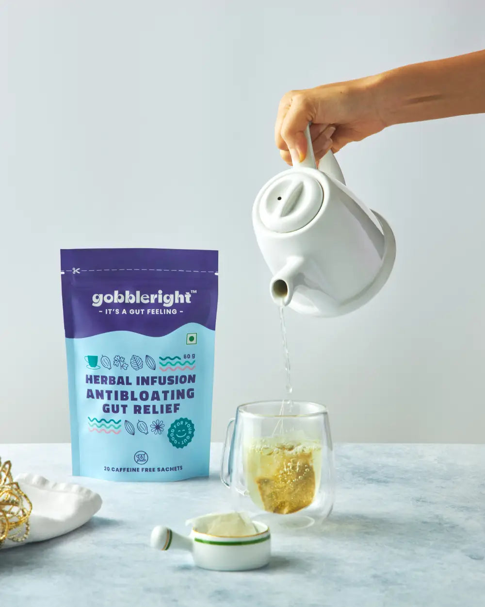 Add a sachet of Antibloating gut tea to the cup